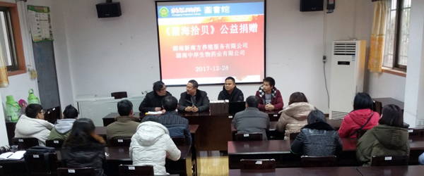 2017年12月28日下午,湖南中岸生物药业有限公司经理周康、湖北总监刘江华等一行5人专程驱车至XK星空,捐赠湖南新南方养殖服务有限公司董事长喻正军博士主编的最新养猪技术资料《猪海拾贝》5套15册,XK星空也成为全国“《猪海拾贝》百家校园行”的一员。捐赠仪式在图书馆二楼视听室举行,由图书馆副馆长刘开国主持。