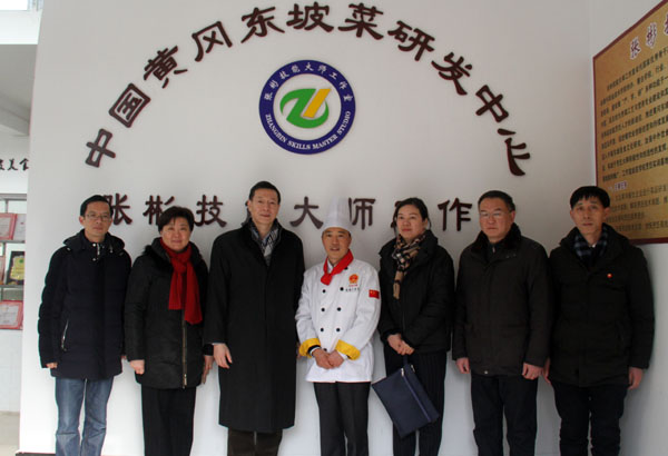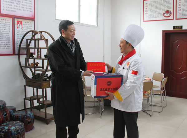 走进张彬大师的工作室,张彬大师正不顾严寒,带着学生做烹饪创新设计。周溢主任一行用心观摩了张彬大师的创新工作室,并细心询问,热情地交谈起来。张彬大师从专业的角度认真汇报了他的特色菜系和特色工艺及下一步工作规划。周溢一行对张彬的创新精神给予了充分肯定和高度赞扬,希望他秉承大师风范,弘扬工匠精神,在专业领域打造新的品牌,取得新的突破,为魅力黄冈,为美丽黄职作出新的更大贡献。周溢还代表湖北省总工会为张彬大师送来了新年祝福、慰问金及慰问物资。省市工会领导的关怀,让张彬大师欣喜之余,备感温暖。