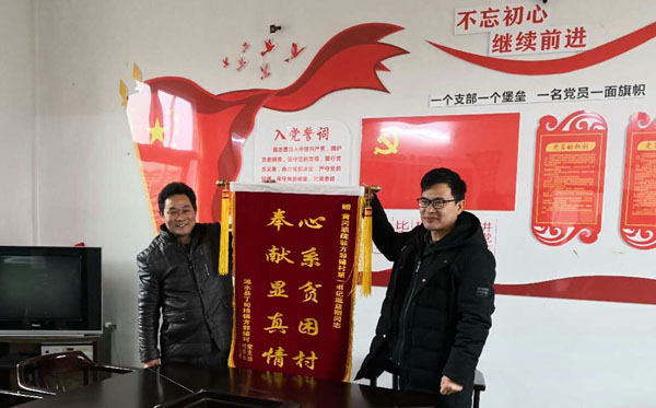 方郭铺村父老乡亲对戴益刚同志的离任依依不舍,为表达对学校的真诚感谢和对戴益刚同志的留念,村支书李前进同志代表村两委赠送了“心系贫困村,奉献显真情”的锦旗。