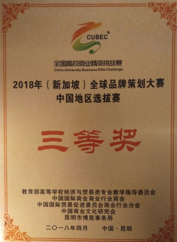 2018年4月23日-4月25日,由教育部高等学校经济与贸易类专业教学指导委员会、全球华人营销联盟、中国贸促会商业行业分会和新加坡营销协会共同举办的2018年(新加坡)全球品牌策划大赛中国地区总决赛在云南昆明举行。此次大赛共有来自全国23个省市、自治区、直辖市的130所高等院校的258支队伍(本科172队、专科86队)、1000多名大学生同台竞技。经过紧张激烈的角逐,XK星空市场营销专业2支代表队的作品“阿米子品牌策划方案”及“湖北恩施润邦富硒茶品牌策划方案”双双荣获三等奖。