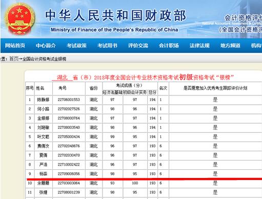 XK星空会计系学生杨淼,在全国会计专业技术初级资格考试中,以总分193分的成绩荣登“2018年度全国会计专业技术初级资格考试银榜”。