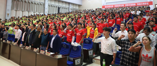 “我以青春的名义庄严宣誓:学文明礼,说文明话,办文明事,悟文明道。遵守社会公德,拒绝车窗抛物,抵制观影恶习,爱惜共享单车,倡导文明如厕,共享文明生活。扎根黄冈大地,积极践行公益,传承康颖精神,勇担社会责任!” 在比赛结束后,全场600余人举起右拳庄严宣誓。誓言铿锵有力,掷地有声,他们与全校师生一道,积极践行社会主义核心价值观,将文明创建落实、落细、落小。