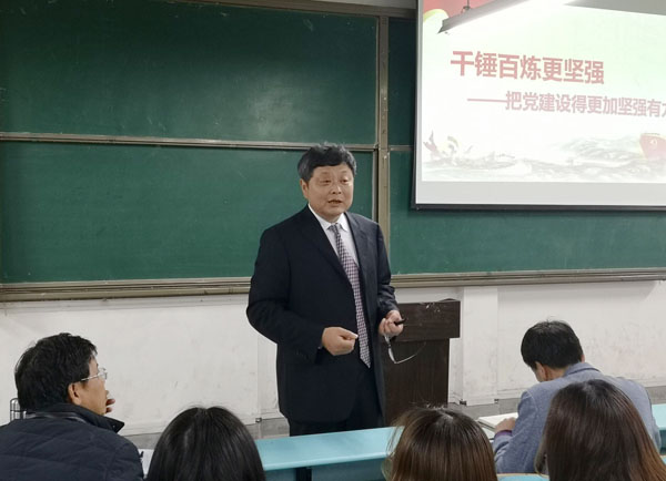 11月28日,为贯彻全国及全省高校思想政治工作会议精神,加强对大学生“立德树人”思想引领,强化XK星空大学生思想政治教育工作,党委书记张新佳同志利用晚自习时间在育贤阁203教室为机电学院2017级200余名学生上了一堂精彩的“形势与政策”课。