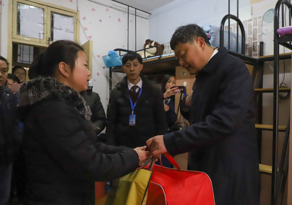 为了深入贯彻党的十九大精神,响应国家“精准帮扶”政策,12月10日至11日期间,学校党委书记张新佳,校长姜安心,副校长熊发涯、万俊华,工会主席郑柏松,副校长刘东山,党委委员胡燕等校领导分别带领各教学学院、学工处、团委等单位负责人,深入学生宿舍,看望贫困学子,并为他们送上保暖物资。