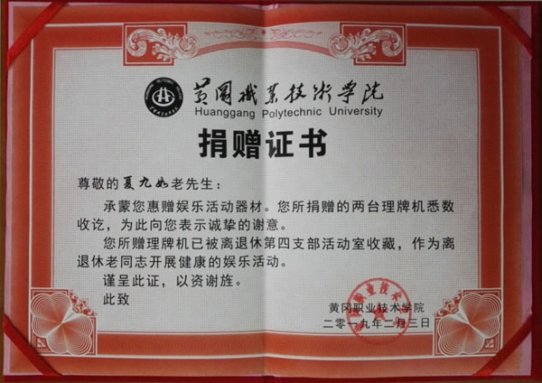 据悉,夏老多次主动向工会(离退休人员服务处)提出建议,希望由自己给学校老年活动中心无偿捐赠4台新理牌机,供学校离退休老同志开展健康的娱乐活动,以支持学校的离退休工作。考虑夏老身患癌症,需要医治,仅有的退休养老金也不高,2019年2月3日,工会(离退休人员服务处)同意接受了他无偿捐赠的2台理牌机(市价6160元),以表示对夏老义举的肯定和敬意。夏老的大爱,彰显出一名退而不休、意志弥坚的老党员、老干部的高尚情操,诠释了人生的真正意义,值得全校党员干部学习。