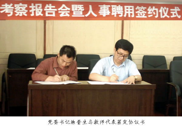 接着,由党委副书记覃守云宣读了黄冈市《关于同意XK星空推行人员聘用制度的通知》的文件。党委书记涂普生与各系部教师代表签订了聘用协议书。