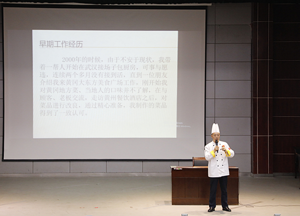 5月14号晚,学校开展“迎祖国七十华诞 展职教时代风采”职业教育活动周技能大师讲坛活动,活动邀请“全国五一劳动奖章获得者”“中国注册烹饪大师”“黄州东坡饼传承人”“湖北省技术能手”“商学院烹饪专业技术带头人”张彬作专题报告。学校党委委员、工会主席、宣传部部长郑柏松及全校600余名师生在学术报告厅聆听了报告会,报告会由学生工作部(处)副部(处)长、团委副书记崔现强主持。