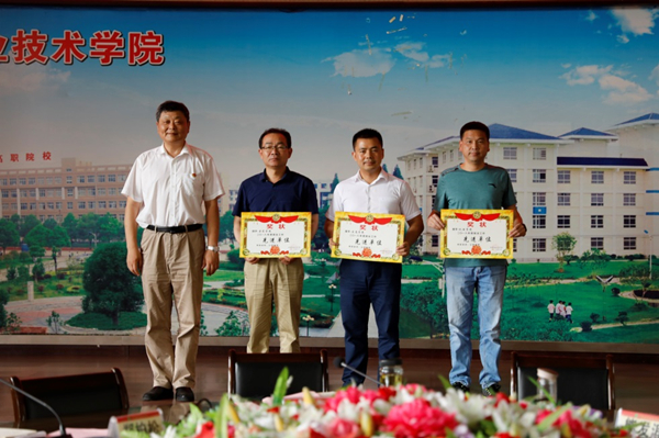 党委书记张新佳(左一)为“就业工作先进单位”颁奖