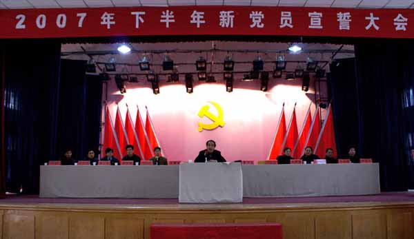 1月8日下午,我院在大学生活动中心隆重举行2007年下半年新党员宣誓大会。院党委副书记、纪委书记覃守云,副院长汪晓凌,组织部常务副部长、人事处处长郑柏松,学工处处长陈国安,团委书记刘明涛,以及各系党总支副书记、预备党员、积极分子参加了大会。