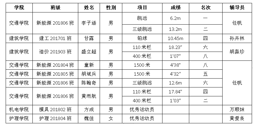 据悉,为迎战本次省大运会,XK星空公共课部田径队指导老师袁九宗、陈亮宇在辅导员老师大力配合下精心挑选出参赛运动员,狠抓平时的训练量,力求运动员在比赛场上取得优异的成绩。参赛前夕,公共课部领导为所有运动员及教练员作动员,鼓士气;运动会期间,公共课部领导老师赶到运动会现场为运动员们呐喊助威。参赛师生们对取得的成绩倍感自豪,同时也更加自信,下定决心争取在下一届大运会上取得更加骄人的成绩。