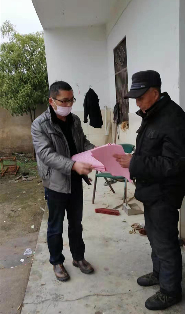 腊月二十八,当所有一家之主在置办年货、准备过年的时候,梅山村支部书记赵勇军还在村里安排年底收尾工作。原以为跟往年一样,二十九忙完就可以在家陪父母妻儿过一个安定祥和的春节,来弥补一年来因忙于工作而缺失的陪伴和关爱。结果,由于新型冠状病毒引起的肺炎疫情形势十分严峻,防控工作刻不容缓,杉木乡政府腊月二十九召开紧急会议,安排部署全乡疫情防控工作。疫情就是命令,防控就是责任。散会后,赵勇军迅速行动,第一时间召开村两委会议,传达上级相关精神,统筹安排村级防控工作,在村主要干道张贴县防控指挥部通告,挨家挨户发放《致全县父老乡亲的一封信》。