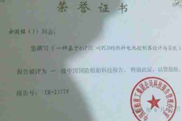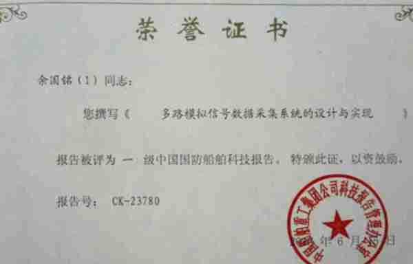 2013年他荣获中国船舶重工集团公司颁发的两项“一级中国国防船舶科技报告”荣誉表彰。