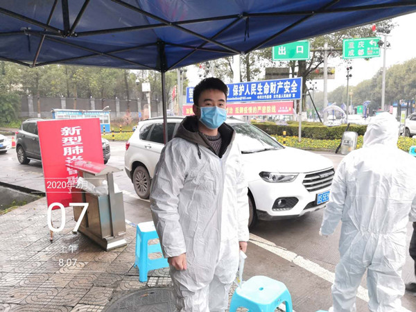 口腔201930班的陈金领是河南人,长期生活在云南昆明寻甸县倘甸镇,工作于寻甸倘甸健美口腔诊所。疫情当前,他利用诊所的便利自己出资,多次捐赠口罩共计1000余个、84消毒液25公斤、乳胶手套50双。他于2月7日主动去镇政府报名加入防疫志愿者的队伍,2月8日便进入倘甸鲁嘎堵卡点值勤。由于地方消毒防护物资缺乏,他自己筹备红外体温表、水银体温计、手术衣、口罩、手术帽、面罩等防护物品,加入到排查过往车辆、测体温、登记、宣传的队伍中,对外来车辆人员耐心劝返,9至10日是风雨天气,但他仍坚守阵地。陈金领说: “为防疫工作做些力所能及的事是我们身为医务工作者应负的社会责任,同时也是我们的荣幸。主动去防疫一线,我们从未后悔,愿疫情早日退去!黄冈加油!武汉加油!中国加油!”
