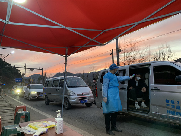 陈金领为往来人员测量体温