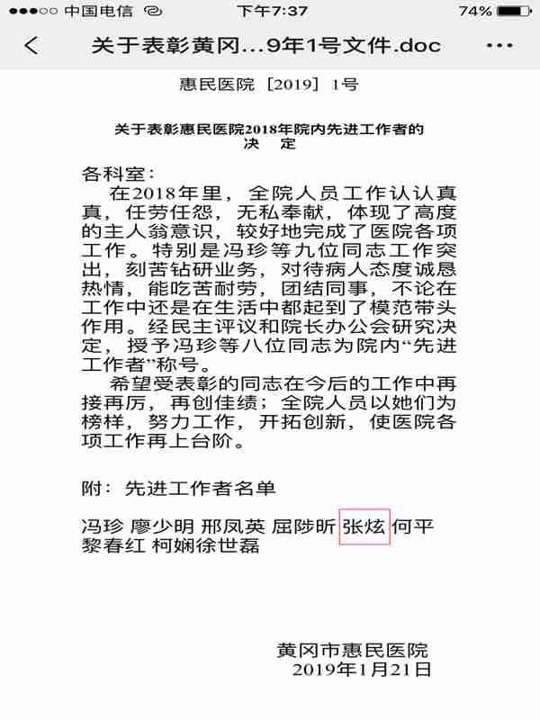 张炫荣获“惠民医院2018年院内先进工作者”称号