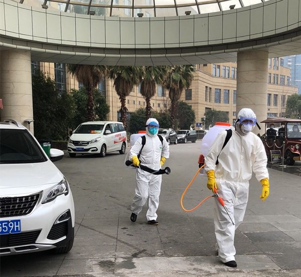 2月25日张炫(前一)在纽宾凯瓦尔登酒店执行消杀任务