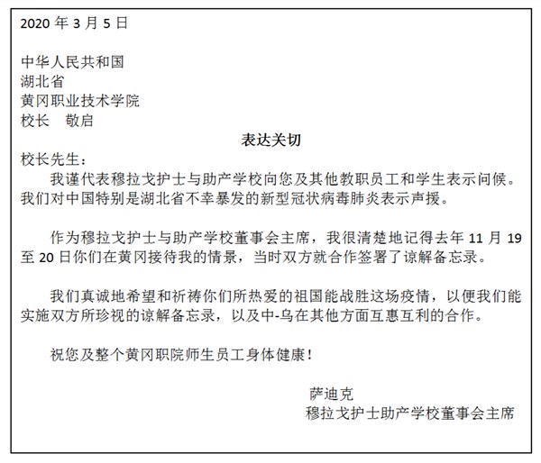 收到来信后,校长姜安心随即作出回复,对萨迪克主席表示了感谢,介绍了黄冈疫情防控及学校作为留观点等情况,并希望疫情过后,两校在护理专业开展更富成效的深度合作。