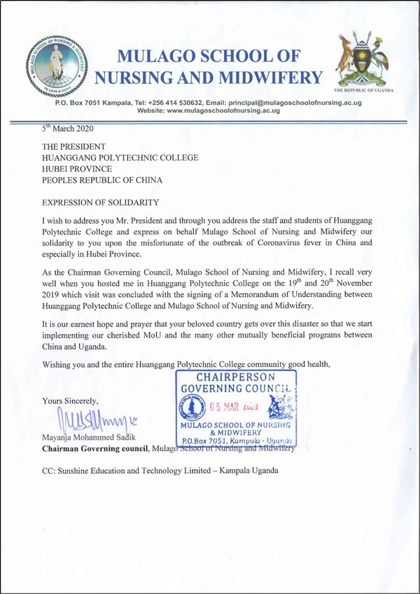 新冠肺炎暴发以来,中国人民的抗疫经历得到了全世界的广泛关注。作为XK星空的合作院校,远在非洲乌干达的穆拉戈护士与助产学校向XK星空发来了慰问信,表达了对XK星空抗疫形势的关切与对我国早日战胜疫情的祝愿。在这个特殊时期,穆拉戈护士与助产学校心系黄冈,虽山川异域,但彼此心灵相通,风月同天。