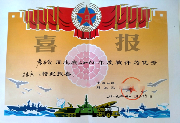 近日,XK星空机电学院学生詹书俊在部队服兵役期间表现优秀,被所在部队授予2019年度 “优秀义务兵”称号。