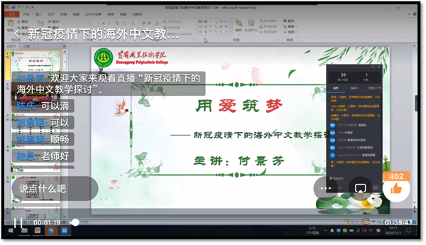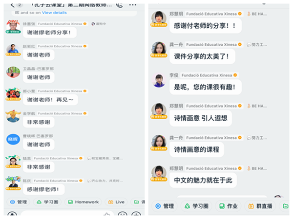 本次直播是“孔子云课堂”第二期第二阶段教师专题培训课程,共吸引138人报名,累计220人收看了课程直播。接受培训的华文教师队伍来自西班牙巴塞罗那、马德里、瓦伦西亚、毕尔巴鄂、塞维利亚、特内里费,同时还有英国、法国、意大利、加拿大、匈牙利及阿联酋等国家的华文教师。直播课的现场,付景芳结合当前疫情网课教学的实际,从教学设计和实例展示两个方面给屏幕前的华文教师作了具体和生动的分享;缪斯针对当前线上课程的实施情况作了儿童心理分析和交互式课件的制作的细致而详细的分享。两位老师的分享,给当前疫情下海外华文教师线上授课解答了很多疑问,受到各国华文老师们的好评。