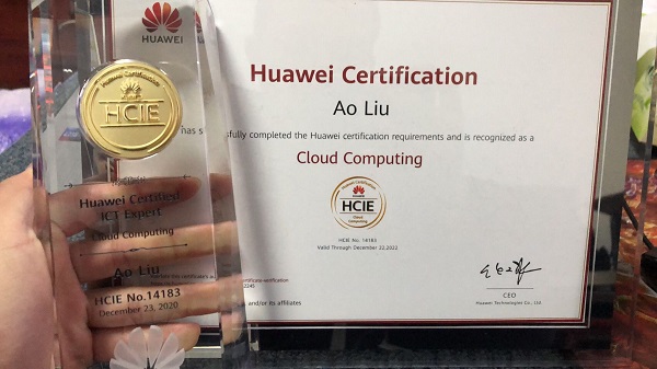 学校云计算201801班刘澳,在老师的指导和自己的努力下,每天学习10小时以上,终于成功获得华为“HCIE-Cloud Computing”认证,此证为华为云计算领域专家级知识和技能的考察和认证,分笔试、实验和面试三个环节,是华为认证体系中最高级别的ICT技术认证,认证编号永久保持。