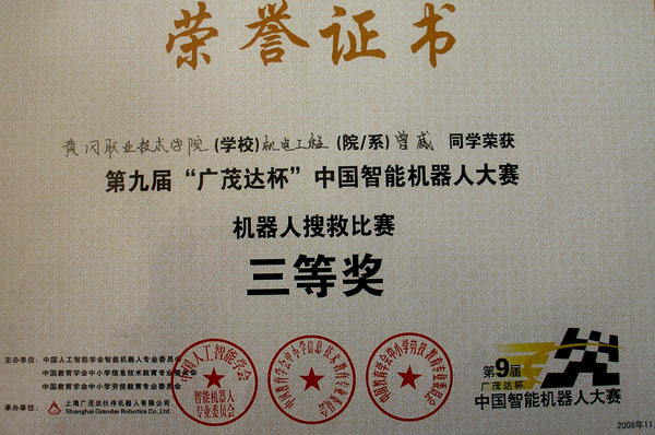 2008年11月13日—14日,第九届中国“广茂达杯”中国智能机器人大赛在上海宜川中学体育馆隆重举行。机电工程系由吴兵、张峥、廖谦、曾威四名同学组成的代表队,精益求精设计、积极主动创新,在全国164家参赛院校中脱颖而出,获得全国一等奖一项、三等奖一项的好成绩,位列全国高职院校首位,全国高校前列。金、铜牌和证书已发下来,特向全院师生报喜。