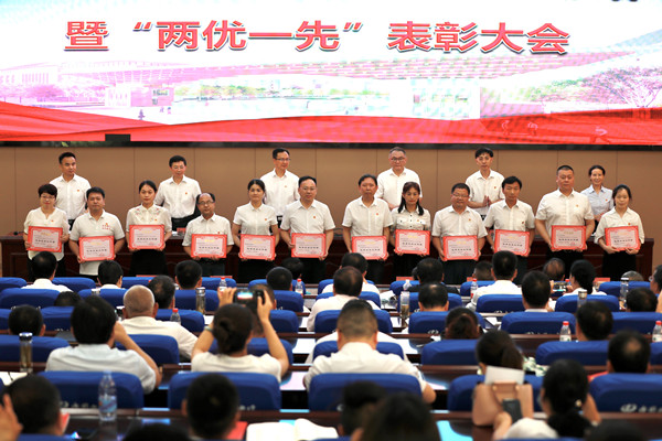 6月28日上午在教师发展中心召开了2021年党建工作总结暨“两优一先”表彰大会。校党委全体成员出席了本次大会。全体例会人员、党总支副书记、党支部书记、受表彰个人、“光荣在党50年”老党员、发展的新党员及教师党员代表近200人参加了大会。会议由党委副书记、校长姜安心主持。