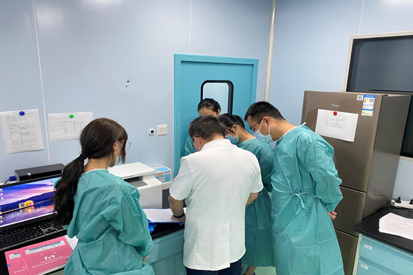 8月8日清晨,检验团队赶到黄冈市中心医院报到并开展工作。他们接收、处理标本,开展基因检测,忙碌而有序,一天饱和检测量达到5000份。8月9日,团风发现疑似病例,实行人员流动管控,潘妮老师立即就近加入团风县人民医院检验核酸检测实验室,协助医院开展核酸检测。她说:“检验人员,实验室都是战场”。