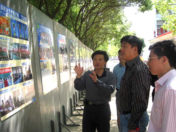 在结束湖北中嘉光电技术有限公司黄冈职院生产车间后,来到土木工程系校企合作、专业建设成果的展牌前,他认真观看了学生的作品,仔细听了土木系主任刘晓敏的介绍,之后,张锦枫处长介绍了我院土木工程系从2002年起就进行项目教学法的改革,成为办学水平评估的一大特色,近几年,开办了针对一个行业而不是一个企业的订单班,学生就业率达100%时,林处长连连点头。