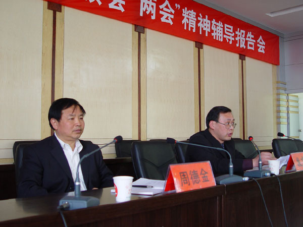 2005年4月14日下午,我院在学术报告厅召开了学习并领会“两会”(人大、政协)精神辅导报告会,欧阳国文老师作报告,周德金院长主持,院领导覃守云、李家瑞、王维华、汪晓凌及各系部处室负责人、副高以上职称教师、副科级上干部出席会议并认真听取了报告。