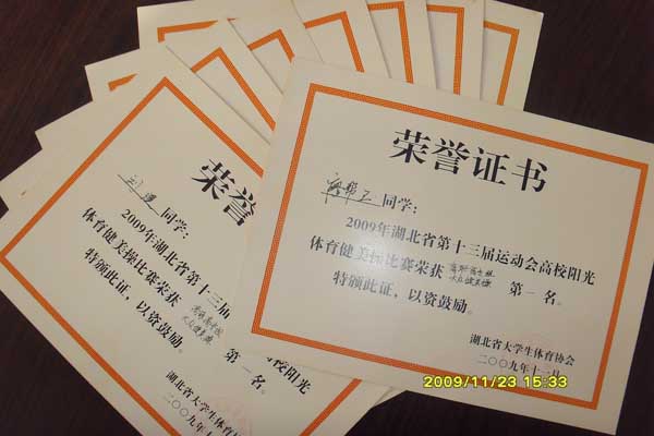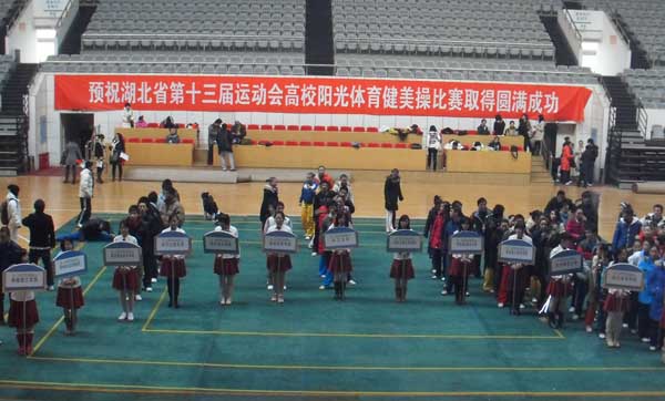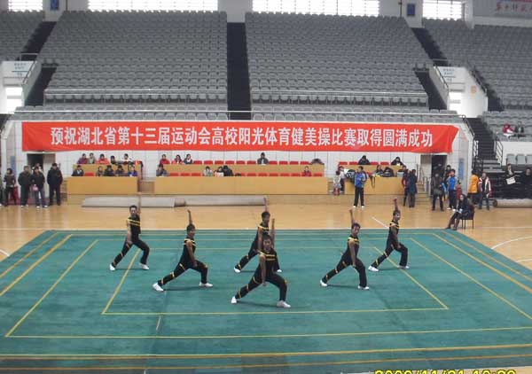 2009年11月21日,湖北省第十三届运动会高校阳光体育健美操比赛在华中师范大学佑铭体育馆举行。我院健美操运动员荣获高职高专组大众健身健美操第一名,三人竞技健美操第一名,特向全院师生报喜!