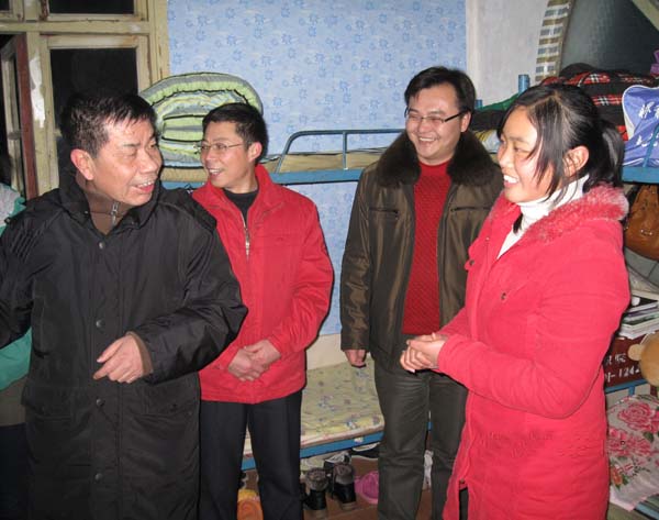 爱心活动分两组进行,张书记带领一组深入北区和中区的人文科学系、经济贸易系、机电工程系和土木工程系的每一栋学生宿舍;陈院长带领一组在中区和南区看望了机电工程系、生物工程系、水利电力交通工程系和计算机科学与技术系的学生。每到一间学生宿舍,领导们都被团团围住,他们热情地为领导老师送茶水,搬凳子,楼外寒风凛冽,室内温暖如春,师生们谈笑风生,亲如一家。这些贫困生来自全国各地,尽管家庭贫困,但都品学兼优。尤其是人文科学系商务英语200905班的来自内蒙古呼伦贝尔市的王金玲同学,父亲丧失劳动能力,母亲体弱多病,姐姐在当地上大学,弟弟上初中,家中经济来源主要依靠政府低保。在院系领导的关心下,该生认真学习,生活节俭,不向困难低头,本学期被推荐获国家一等助学金3000元。当党委书记张鹤桥亲手将防寒保暖物资送到王金玲同学手中时,她非常感激学院,表示要发奋读书,报效祖国,回报恩师们的培养。张书记称赞她有志气、有勇气,希望她相信党、相信学院会继续关心她的生活与学习,勉励她要战胜困难,积极向上,自强不息,争做国家栋梁之才。