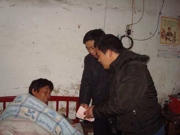 3月6日上午,水电交通系党总支副书记李智、汽车服务200901/02班辅导员卫登科、学生代表查斌和张伟一行四人冒雨前往蕲春县檀林镇詹绍聪同学家中,为他一家送去了水电交通系和同学们的一片爱心。