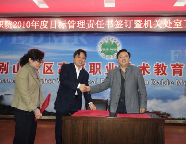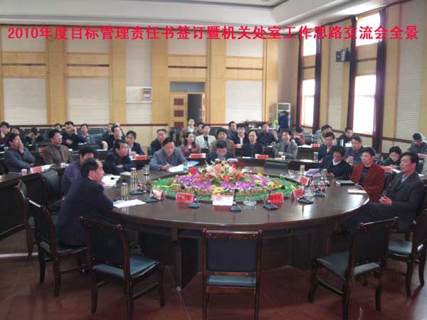 会上,23个机关处室的负责人用PPT逐个进行了2010年工作思路汇报;院长陈年友分别和各单位负责人签订了2010年度目标管理责任状、综合治理责任状;党委委员、工会主席王维华分别和各党总支书记签订了2010年度计划生育责任状;副院长汪晓凌与各单位负责人签订了消防责任状。