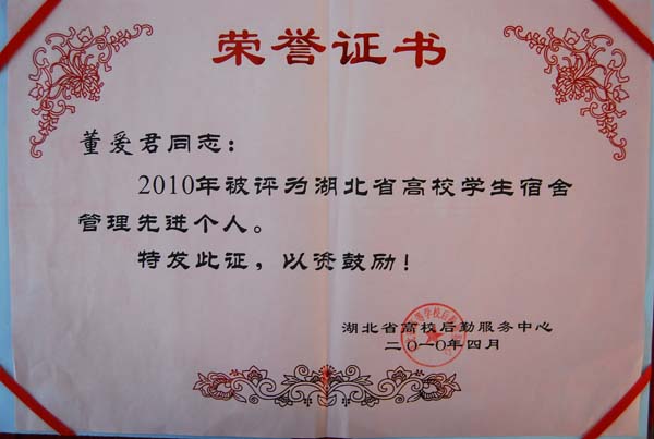 喜报:学院宿舍管理获省级表彰 来源:后勤服务中心 作者:王章春 发布时间:2016-01-24 13:00:17 浏览次数: 次 【字体:小 大】 根据鄂高校后【2010】5号文件获悉:我院被评为2009年度湖北省高校学生宿舍管理先进单位,董爱君被评为湖北省高校学生宿舍管理先进个人。特向全院师生员工报喜。 分享到: 【打印正文】
