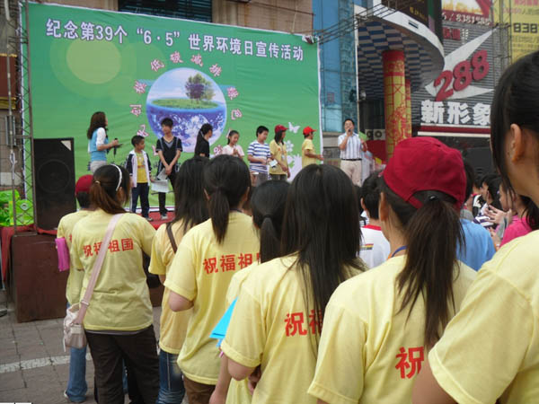 为了提高黄冈广大市民和青少年学生的环保意识,6月4日,生物工程系环保协会与黄冈市环保局、黄州中学联合在黄商集团广场举办了“世界环境日”宣传活动,市环保局副局长欧赟彪,我院生物工程系副主任王银林,院团委副书记陈胜红,生物工程系环保教研室老师程思亮、团总支书记李宁与环保志愿者们一起参与了此次活动。在活动中,市民纷纷驻足观看环保宣传版,还不时与专业老师交流;在婚纱影楼前,新郎新娘也非常高兴的与环保志愿者一起合影留念;在早餐店里,志愿者发放调查问卷,建议他们尽量不要使用一次性碗筷;在商场里,志愿者发放了一万余份环保倡议书和环保购物袋,希望大家少乘一次电梯、空调升高一度、多骑自行车出行,用实际行动体现低碳减排的绿色生活方式。