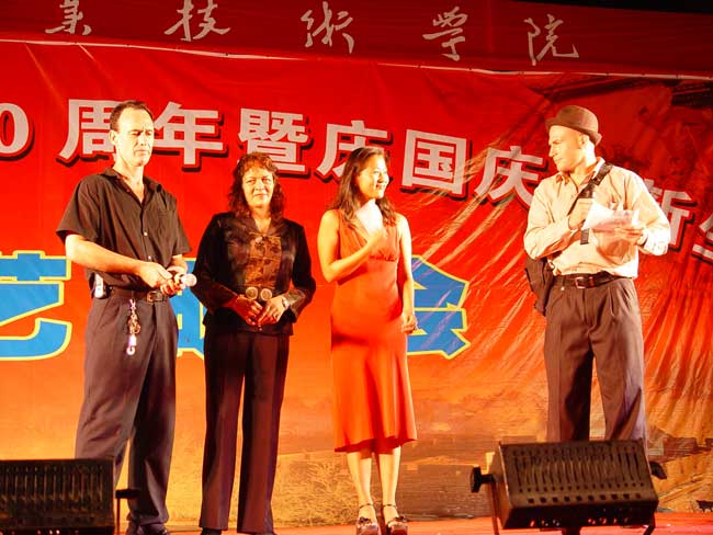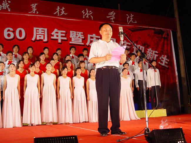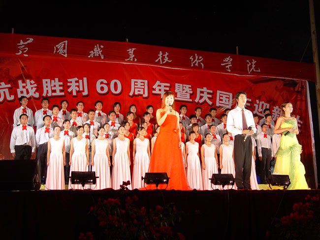 2005年9月29日晚,我院中区球场举行大型迎新焰火晚会隆重庆祝抗战胜利60周年暨欢度国庆。学院党委书记涂普生、院长周德金等院领导兴致勃勃地观赏了由学生们自己导演的这场精彩的晚会。