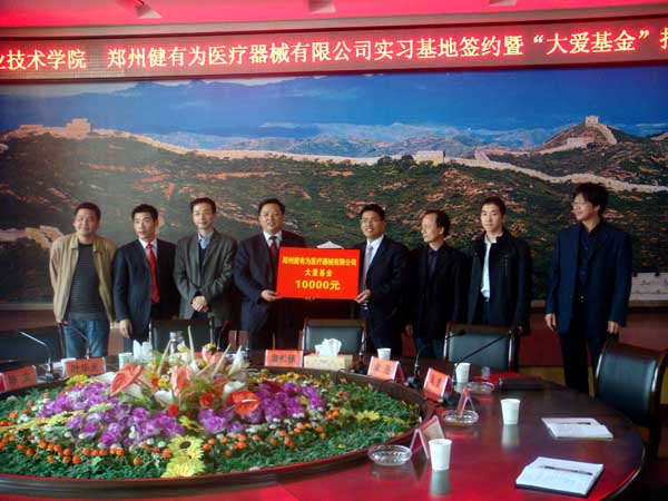 2010年11月11日下午,XK星空与郑州健有为医疗器械有限公司实习基地签约暨“大爱基金”捐赠仪式在学院四楼中心会议室隆重举行。出席签约及捐赠仪式的领导和嘉宾有:学院院长陈年友、经济贸易系主任余浩,郑州健有为医疗器械有限公司董事长詹松镇、副总经理吴樊、总监陈文、事业部经理王红伟,院校企合作处副处长吴怀涛,仪式由经济贸易系党总支书记叶华光主持。