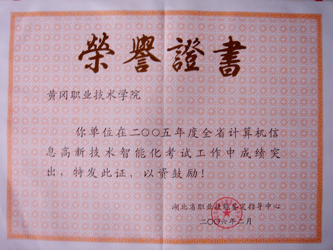 2006年2月24日,在湖北省潜江市由湖北省职业技能鉴定指导中心主持召开的湖北省计算机信息高新技术智能化考试工作会议上,我院计算机信息高新技术智能化考试站(代号43244)荣获湖北省计算机信息高新技术智能化考试先进单位称号,我院考试中心金主任和计算机系熊主任出席了大会,熊主任上台领取了获奖证书并应邀在大会上作典型发言。