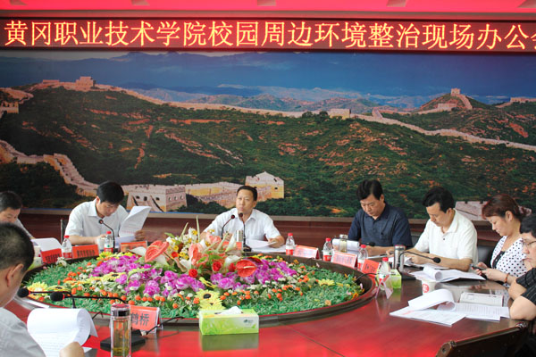 2011年6月9日上午,市长刘雪荣同志带领市政府办、黄州区政府、市综治办、市政府督查室、市城市管理执法局、市公安局、市教育局、市文化局、市卫生局、市工商局、市环保局、市国土局、市城乡规划局、市住建委、市公安交警支队、黄冈供电公司等单位负责人到XK星空,就校园周边环境整治、平安校园建设进行专题调研。学校党委书记张鹤桥、副校长李耀水、副书记王维华、副校长段院生、党委委员郑柏松及相关部门负责人陪同调研。刘市长一行现场察看了学校周边环境情况后,在校办行政楼四楼中心会议室主持召开了办公会。