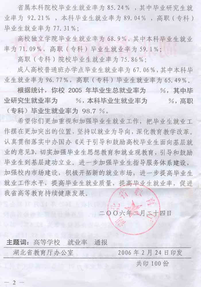 根据湖北省教育厅鄂教学[2006]3号文件《关于2005年全省普通高校毕业生就业率的通报》提供的相关信息,我院2005届毕业生就业率为98.7%,比全省普通高校毕业生总就业率82.6%高出16个百分点,比全省高职(专科)毕业生就业率72.92%高出25个百分点,我院2005届毕业生就业率列全省高校第一,实现了毕业生就业率连续三年过98%的目标。特向全院师生员工报喜!
