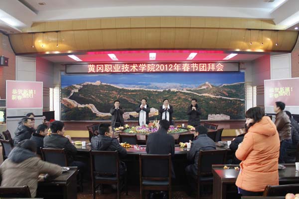 喜庆爆竹辞玉兔,吉祥梅花迎金龙。2012年元月23日,壬辰龙年正月初一,凝智楼中心会议室张灯结彩,喜气洋洋,学校2012年新春团拜会在此隆重举行。校长陈年友,党委副书记王维华,校长助理刘东山、夏学文,部分中层干部、留守学校的值班人员和学生参加了团拜会。党委书记张鹤桥等校领导通过电话委托校长陈年友向全校教职员工拜年。大会由王维华同志主持。