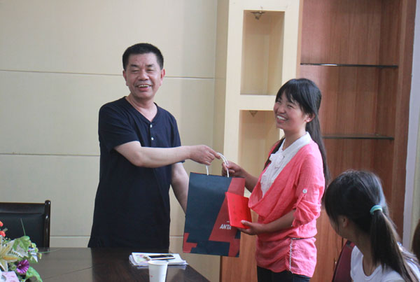 座谈正式开始之前,在热烈的掌声中,张鹤桥代表学校向王定同学颁发了“最佳校园之星”的荣誉证书,并赠送一双安踏旅游鞋,祝愿王定同学在以后的人生道路上一路平安,一生顺利。团委吕晓霞科长代表全校广大青年为王定同学献上了鲜花。