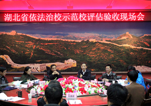 11月16日上午,湖北省依法治校示范校评估验收组负责人、省教育厅郑年春巡视员带领中南财经政法大学教授、博导方世荣,省教育厅政策法规处调研员蔡传德,华中师范大学校办副主任罗丽华,省教育厅政策法规处副主任科员万岩等一行5人来XK星空,对XK星空创建湖北省依法治校示范校工作情况进行检查验收。市教育局副局长刘珍德陪同。