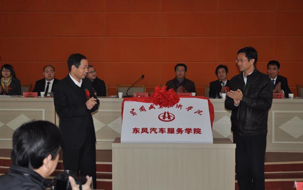 市交通运输局副局长郑志武(左)与校长助理夏学文为XK星空东风汽车服务学院揭牌