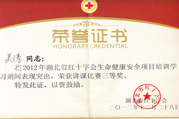 受黄冈市卫生局的委托,2012年12月28-29日,医药卫生学院领导根据湖北省红十字会[2012]24号文件要求,在护理系精心挑选了吴涛、朱琳、黄蓉3名教师,代表黄冈市卫生系统参加了湖北省红十字会组织的“生命健康安全项目授课比赛”活动,并取得一、二、三等奖各1名的优异成绩。