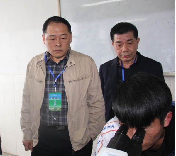 省教育厅招办主任左飞在学校党委书记张鹤桥陪同下巡视生物化工学院技能操作考试现场