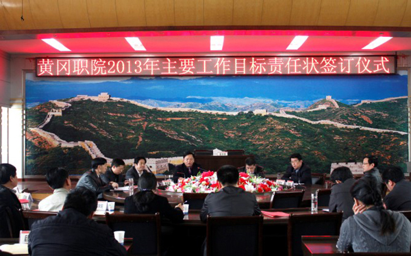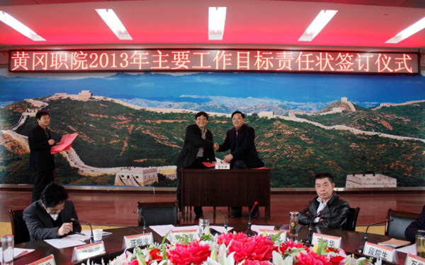 3月28日下午,学校在中心会议室举行2013年度主要工作目标责任状签订大会。全体校领导、各单位中层副职以上干部参加了本次活动。校党委书记张鹤桥主持了责任状签订仪式。校长陈年友代表学校与各单位签订了《2013年度主要工作目标任务书》。