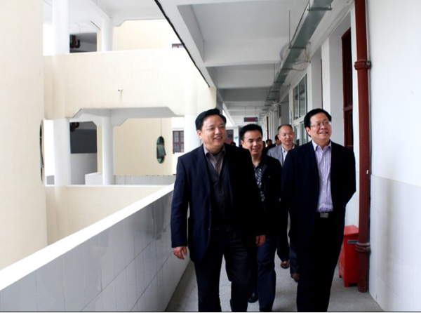 在陈校长(左)等陪同下,吕校长(右)一行参观医学院实训中心