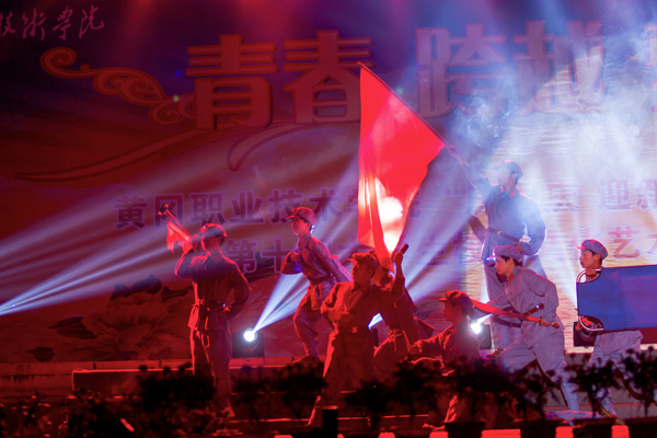 19:00整,伴随着倒计时,舞起乐鸣,散发着青春活力的舞蹈《给力青春》拉开了晚会的序幕,紧接着催人奋进的情景诗朗诵《左手青春,右手成长》、精彩纷呈的社团秀《Club show》、激情四射的街舞串烧等精彩节目轮番上演,掀起了晚会的阵阵高潮。XK星空教职工艺术团的老师们演绎的蒙族舞蹈《鸿雁》,舞姿优美舒展,为观众呈现了一幅蒙古草原的月色美景,曾在第九届大学生校园文化艺术节歌手大赛中获奖的歌手们也纷纷亮相,展示了他们较强的演唱实力,晚会接近尾声时,银白色的瀑布火焰照亮了南湖的夜空,在周海云老师演唱的《致祖国》乐曲声中,黄冈职院“庆国庆 迎新生”暨第十届大学生艺术节开幕式文艺晚会圆满落下帷幕。
